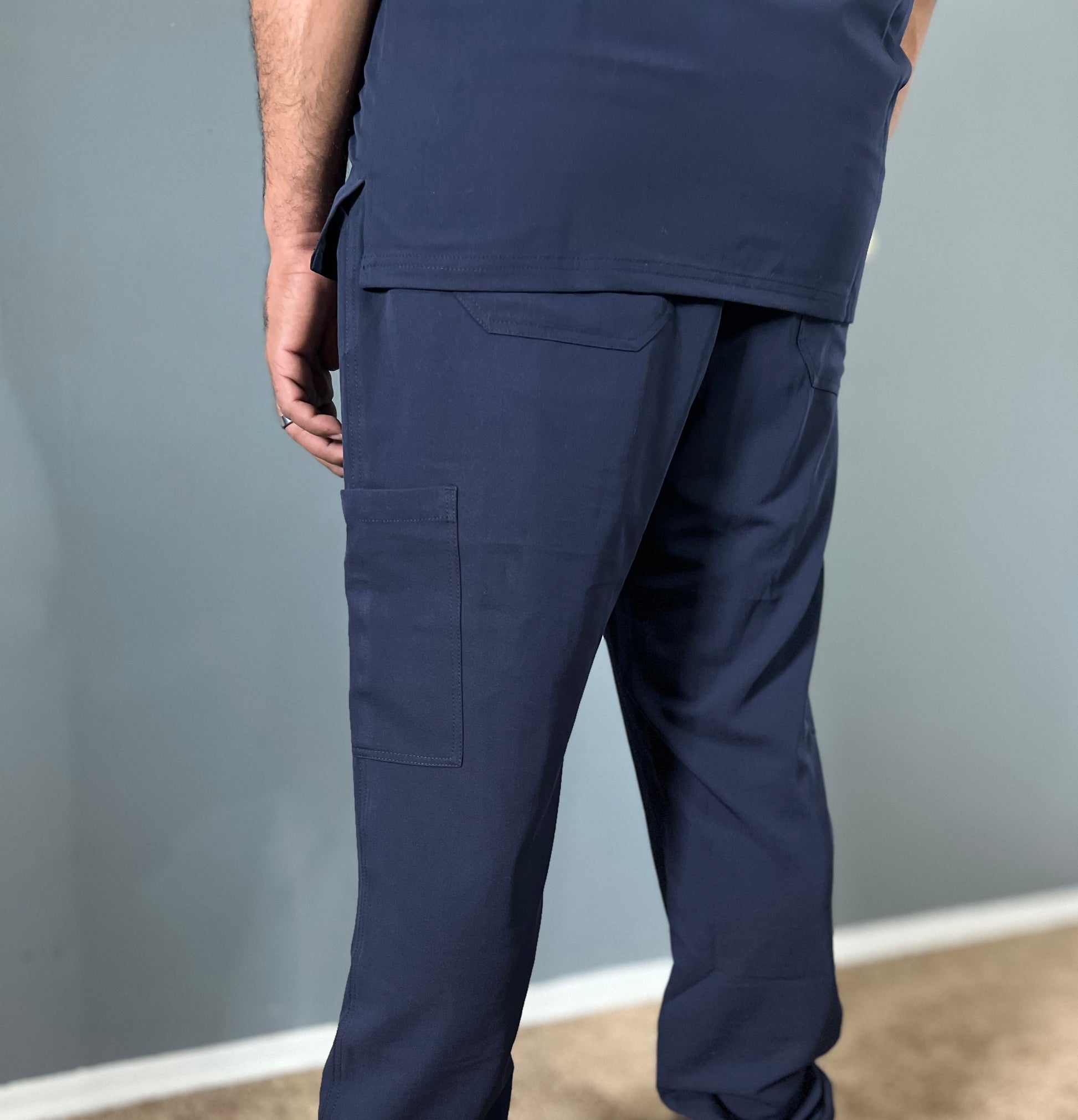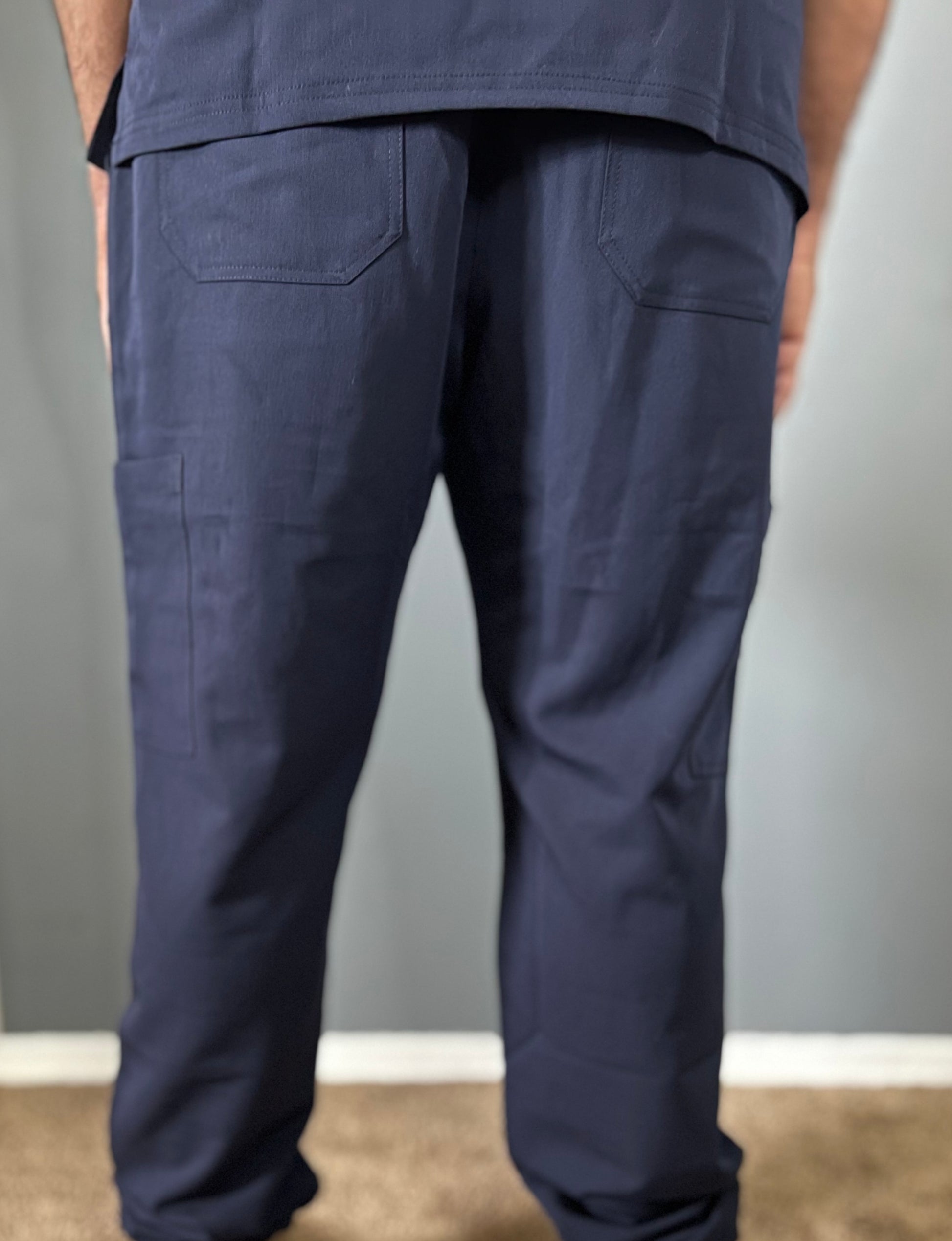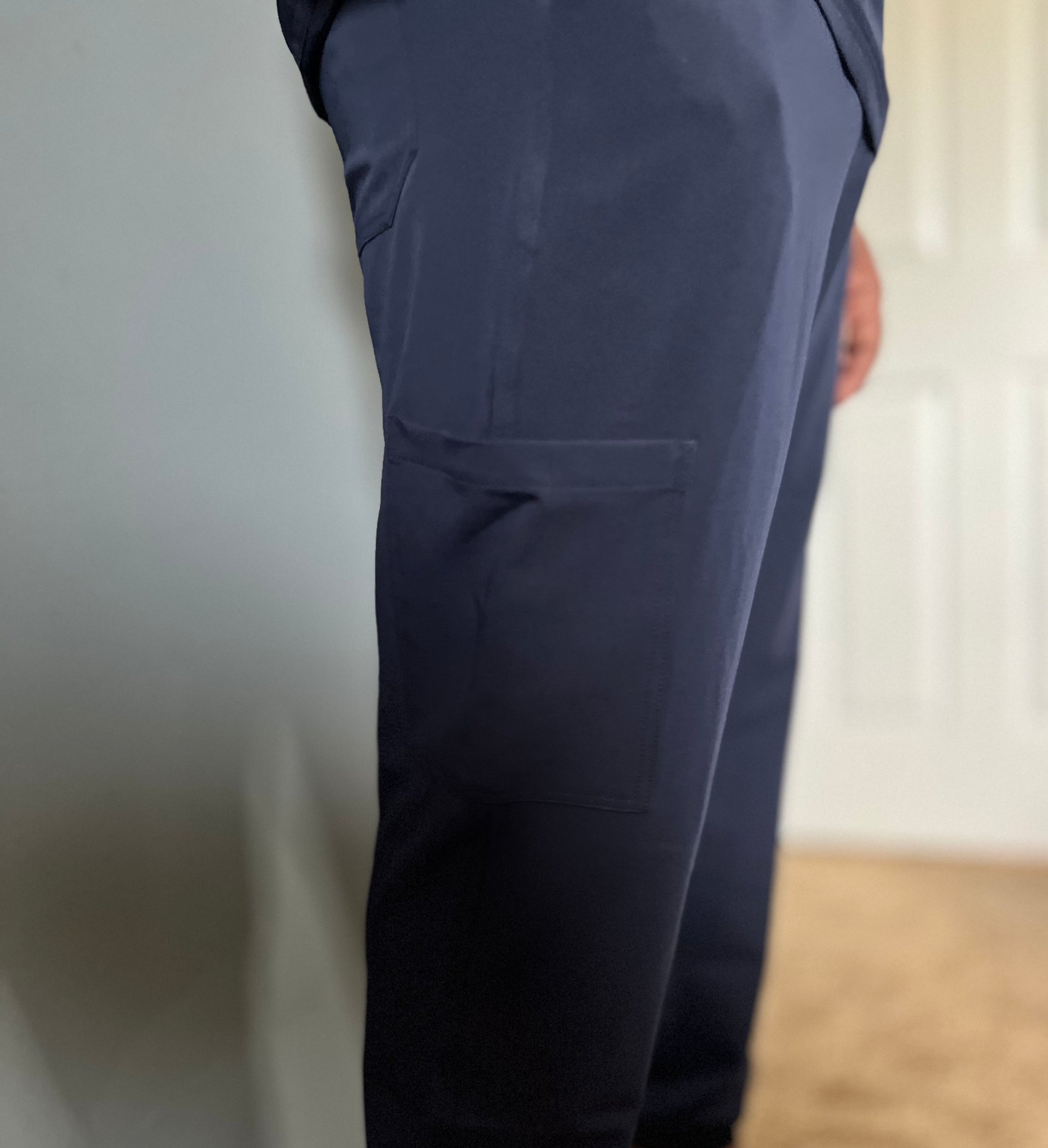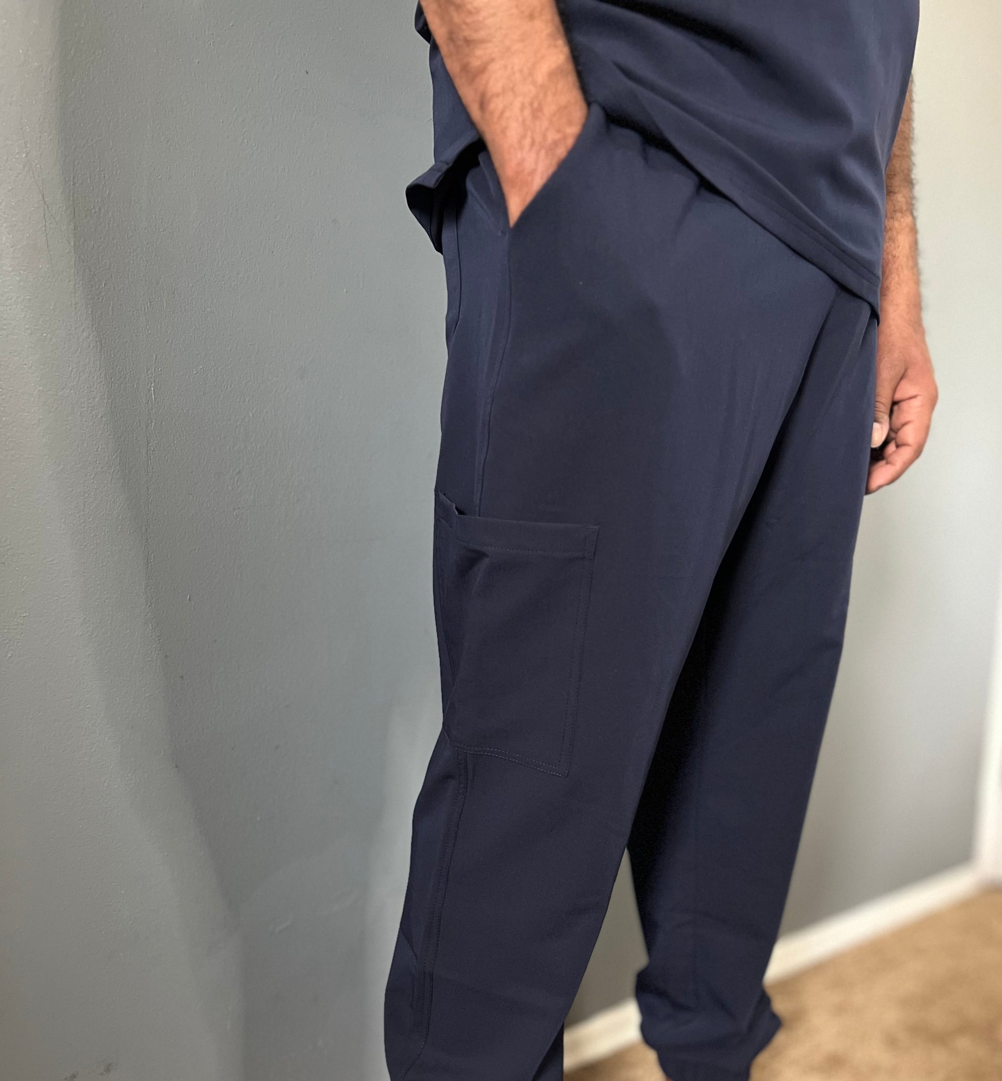 Navy jogger scrub pants with the length of 42.5 inches and inseam of 32.5 inches. Multiple pants pockets including left and right cargo pockets, top pockets and 2 back pockets.